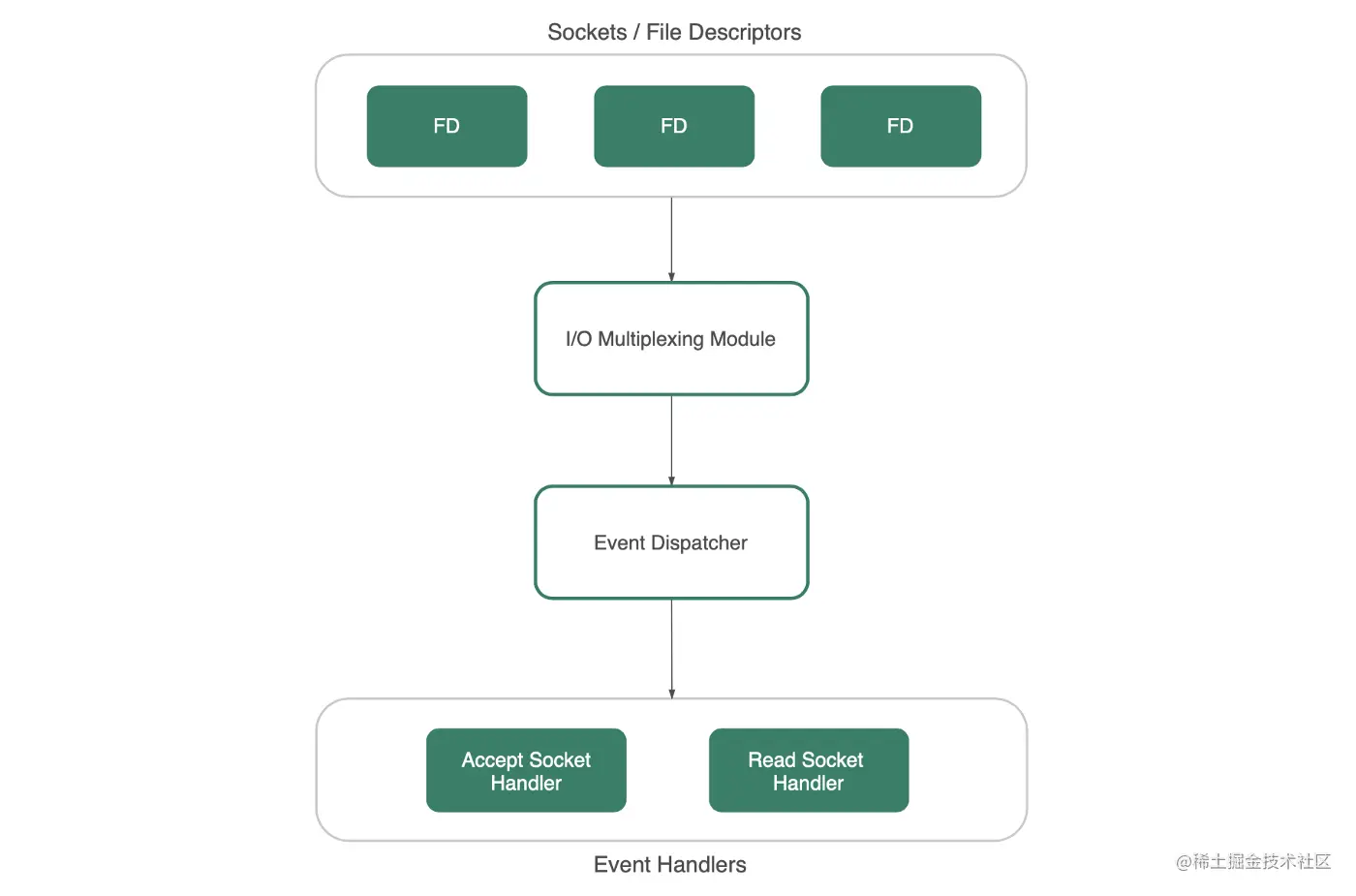 准备好读取的套接字被推送到单线程事件循环,并由相应的处理程序使用Reactor Pattern进行处理。